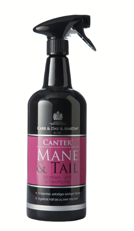 Der Canter Mane & Tail Conditioner von Carr & Day & Martin gilt als bewährter Klassiker unter den Schweifsprays. Die silikonbasierte Formel sorgt für sofortige Entfilzung und spürbar glattes Haar. Der Spray hinterlässt einen leichten Schutzfilm, der vor Staub und Verknotung schützt. Der dezente Citronella-Duft wirkt angenehm frisch.
